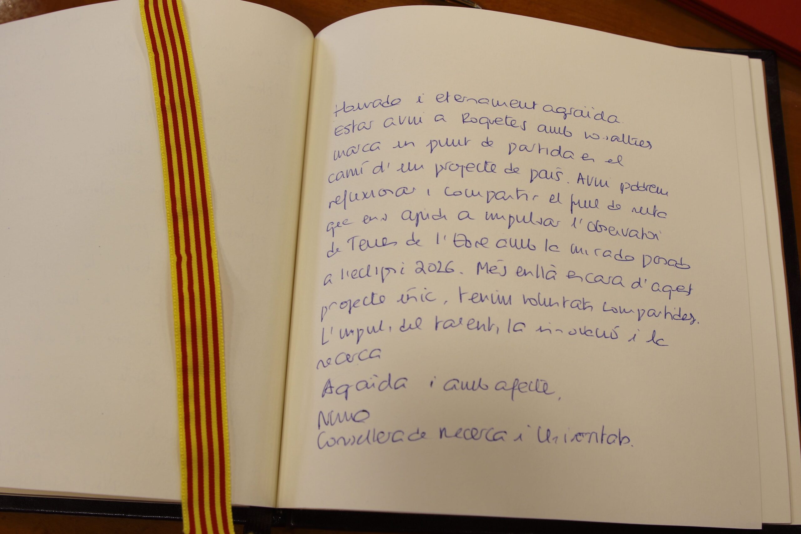Tanmateix, la consellera ha signat el llibre d’honor de la ciutat, i ha fet entrega al batlle d’una rèplica dels plànols del submarí Ictíneo, obra de Narcís Monturiol, els quals formen part de la valuosa col·lecció de llibres de la Biblioteca de l’Observatori.